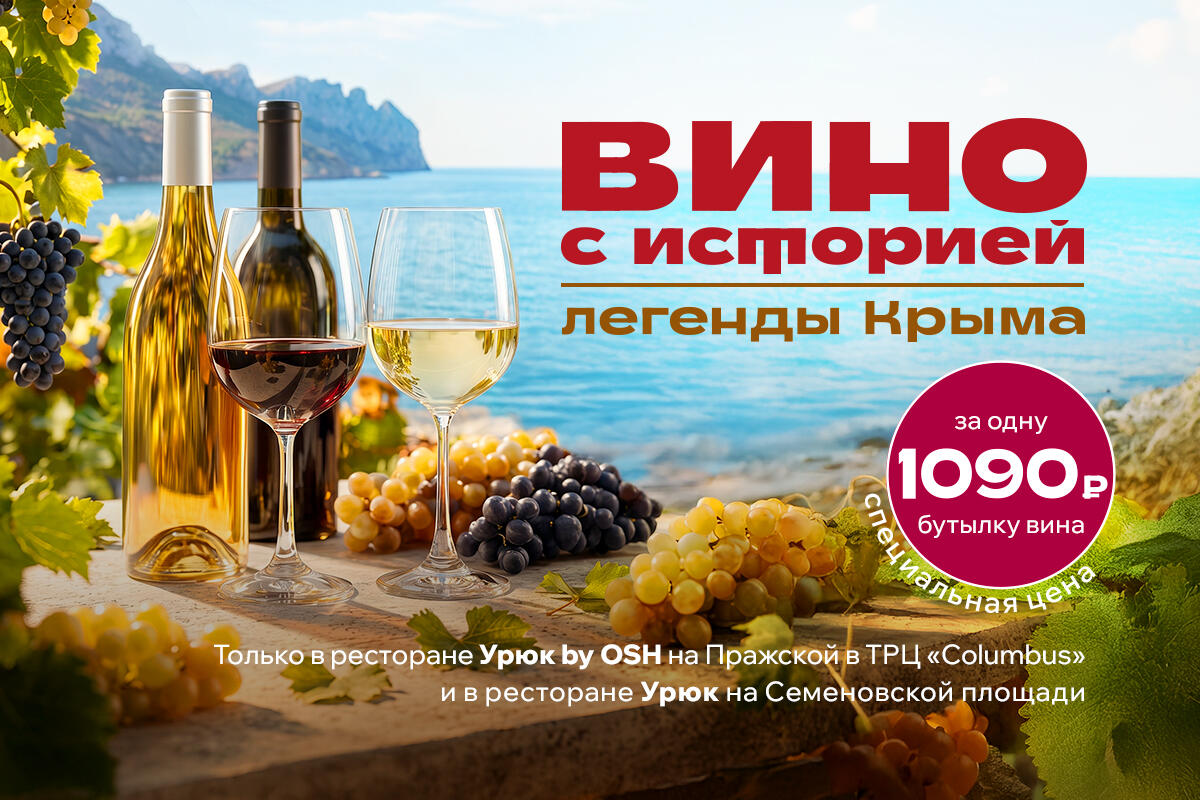 Только в ресторанах Урюк by Osh в ТРЦ Columbus и Урюк на Семёновской действует специальное предложению в меню бара — 1090 рублей на крымские вина (выделенный ассортимент).