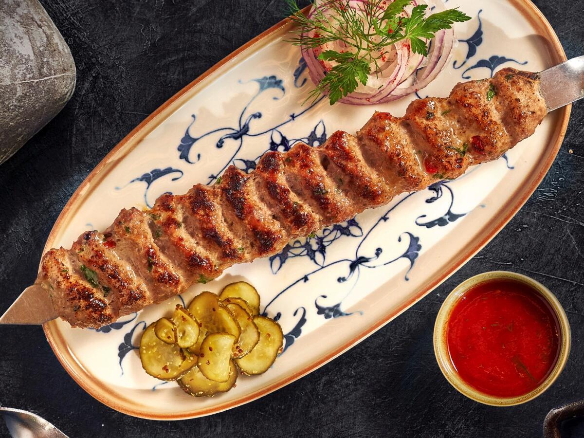 Рубленая телятина с зеленью. Подается с острыми огурцами, маринованным луком и зеленью. Вес 160/30/20 г