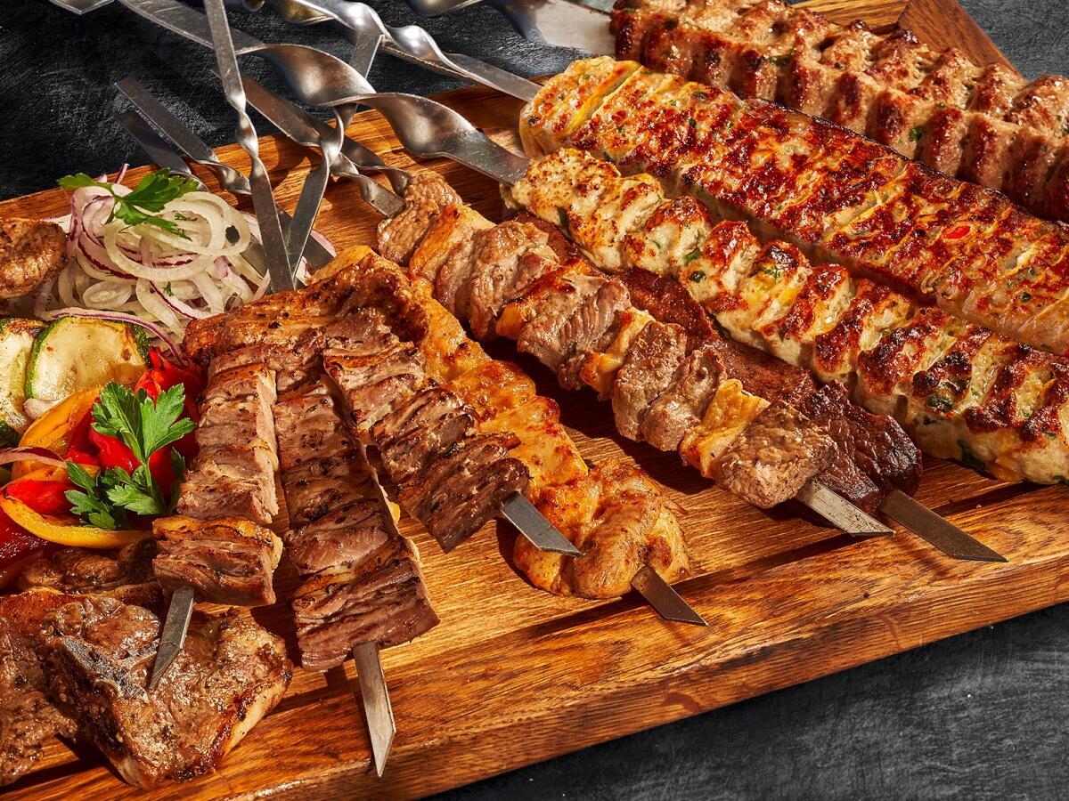 Шашлык из мраморной говядины по-кавказки - 1шт; Бараньи Тибончики - 2шт; Шашлык из баранины - 1шт; Уч Панжа из баранины - 1шт; Шашлык из курицы - 1шт; Кебаб из баранины по-турецки - 1шт; Люля из Телятины XXL - 1шт; Кебаб из Баранины по-самаркандски -1 шт; Кебаб из цыпленка-1 шт; Овощи на мангале - 2 шт; Вес 1460/270/150/210/270/300 г