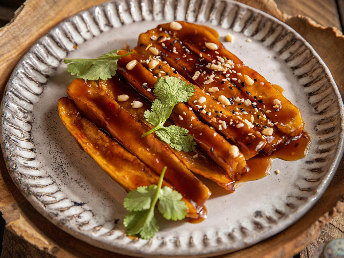 Обжаренные во фритюре ломтики мякоти баклажана в соусе Табаджан. Украшаются кедровыми орешками и веточками кинзы.