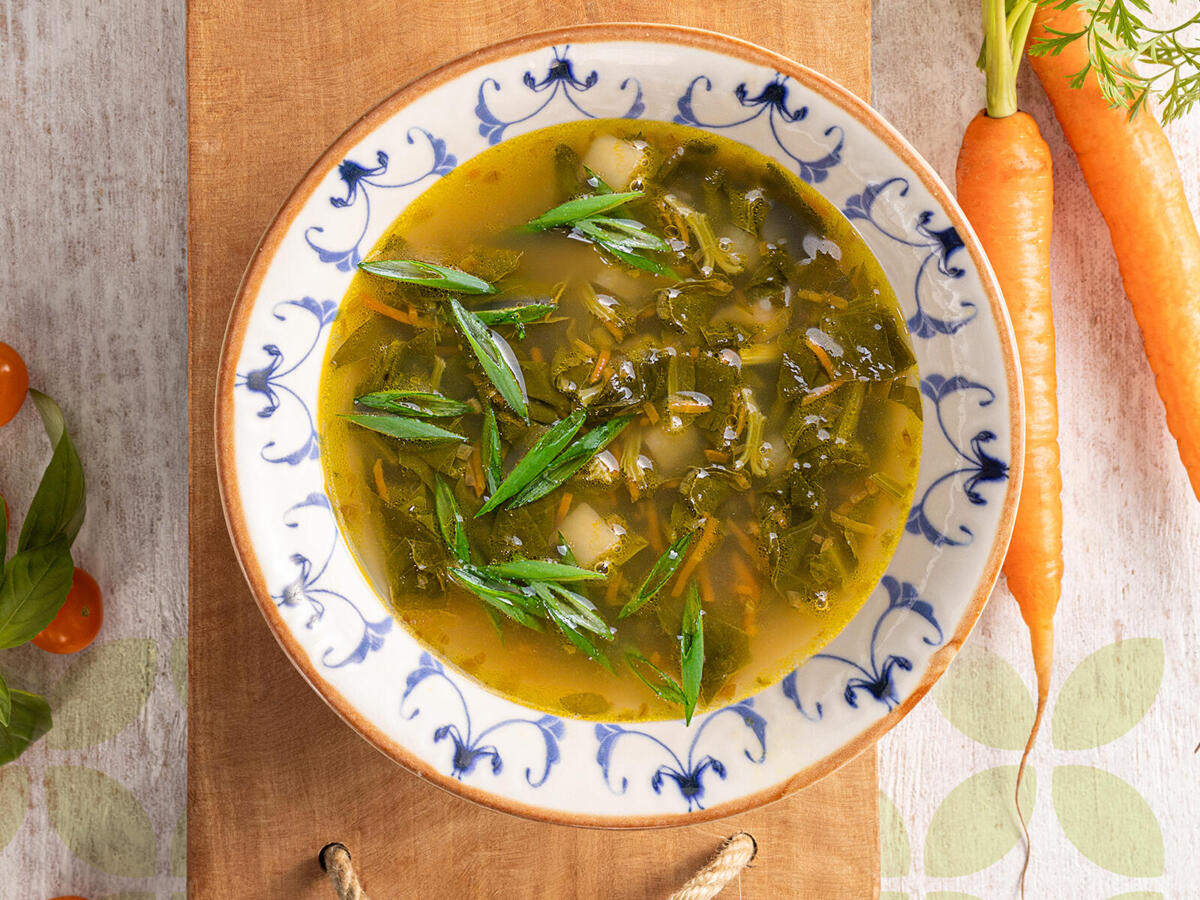 Щавелевый суп на постном бульоне с овощной поджаркой. Подается с постным майонезом и зеленым луком.