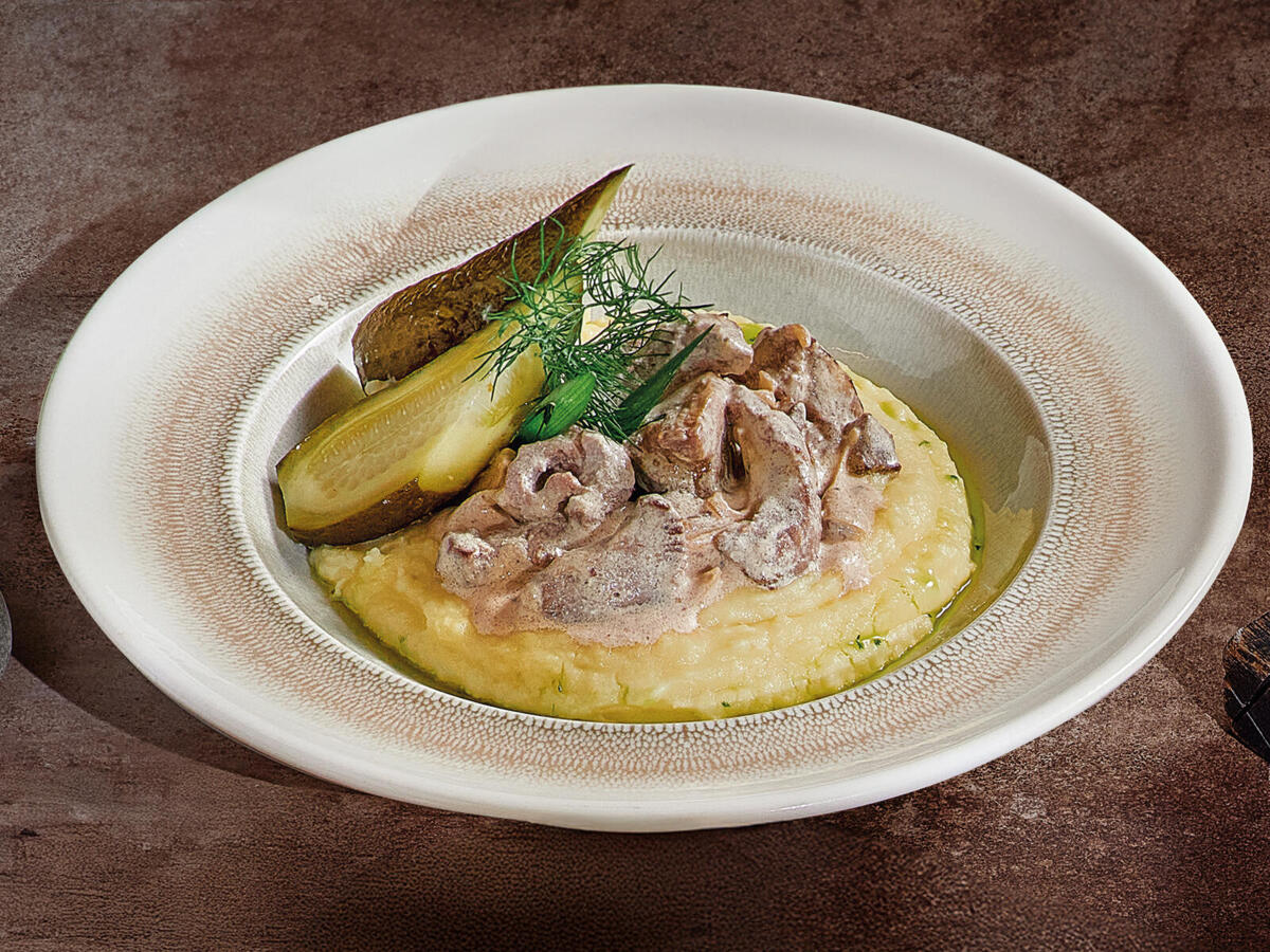 Классика русской кухни. Мраморная говядина в сливочно-грибном соусе. Подается с картофельным пюре и солеными огурцами. Вес 300 г