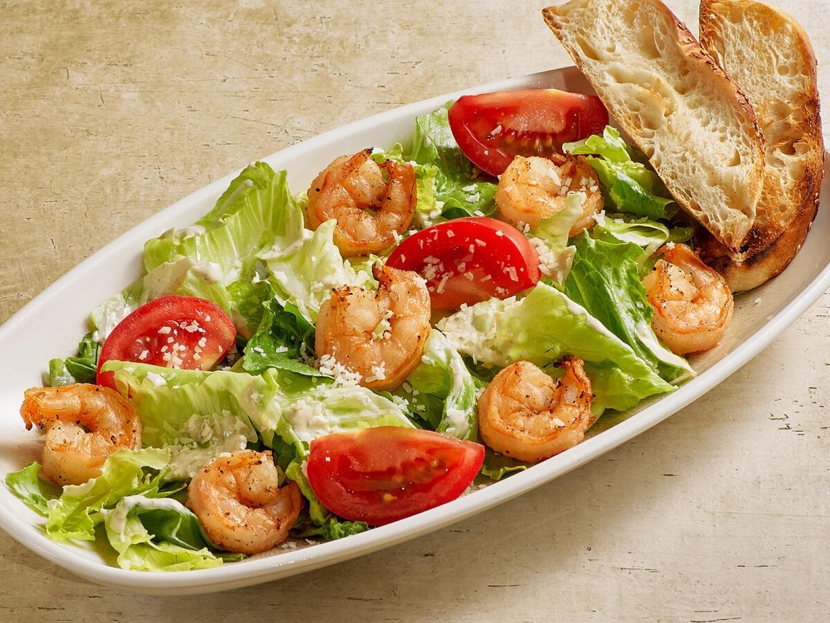 Сочные креветки-гриль с листьями салатов Романо и Айсберг, томатами, хрустящим тостом и Пармезаном под соусом Цезарь. Вес 230/20 г