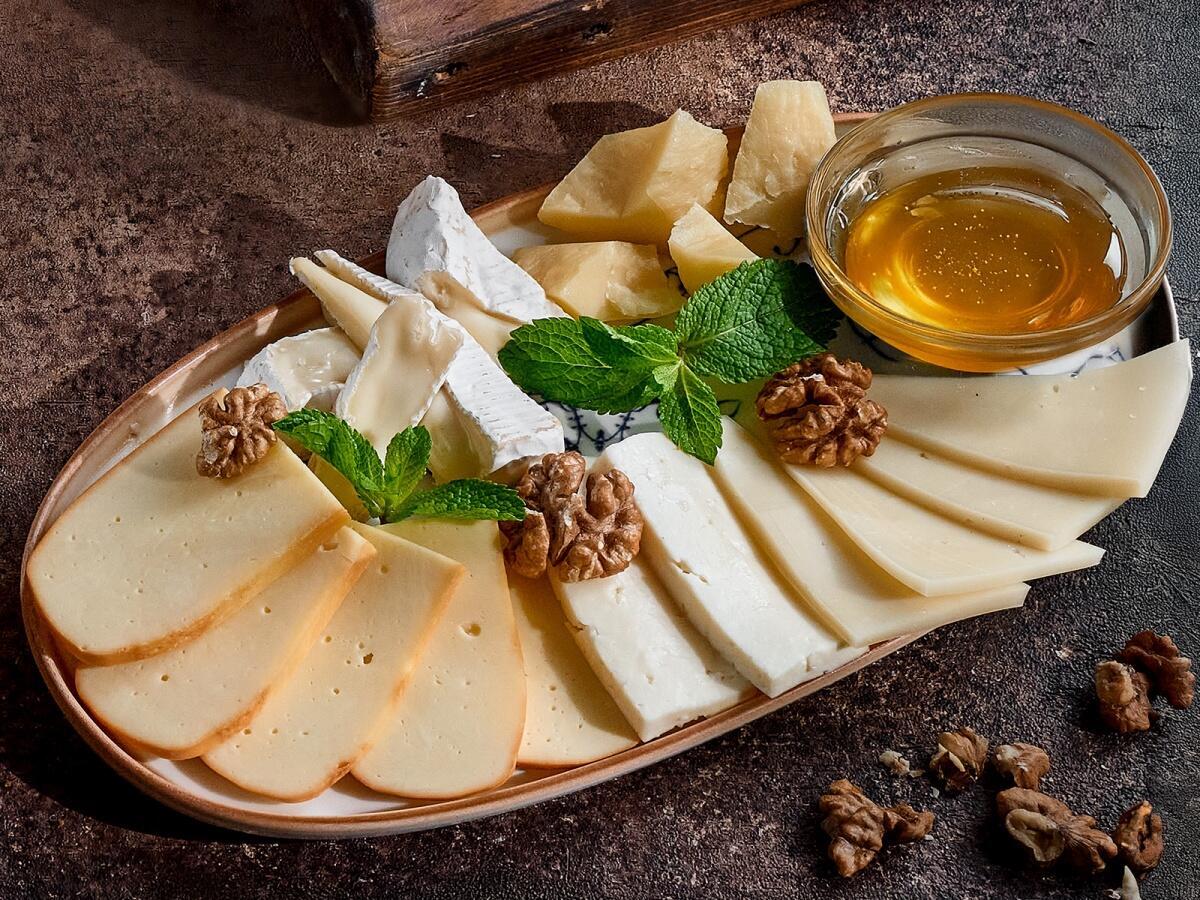 Ассорти сыров: Козий полутвердый, Пармезан, Сулугуни копченый, Бри, молодая брынза. Подается с медом, грецкими орехами и свежей мятой. Вес 180/30/20 г