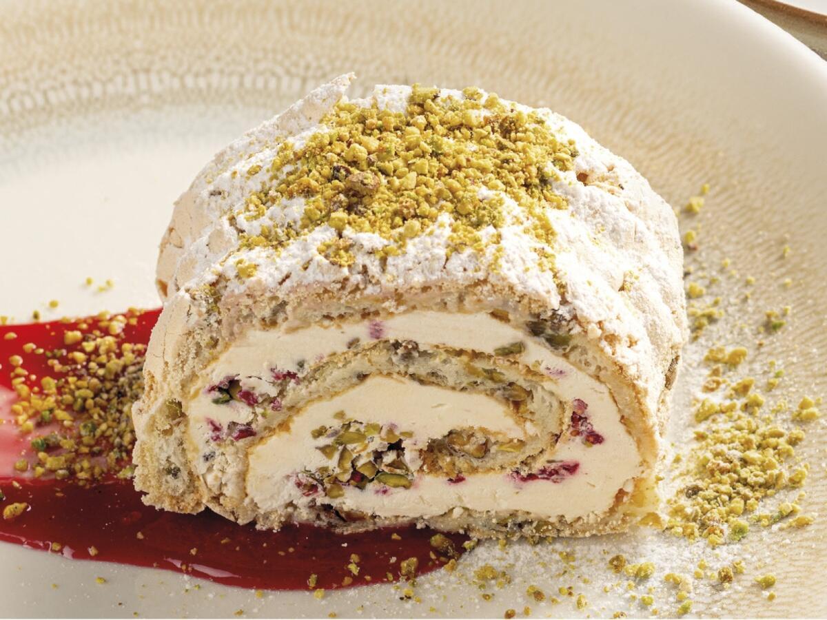 Нежная фисташковая меренга с ванильным кремом и малиной. Подается с молотой фисташкой