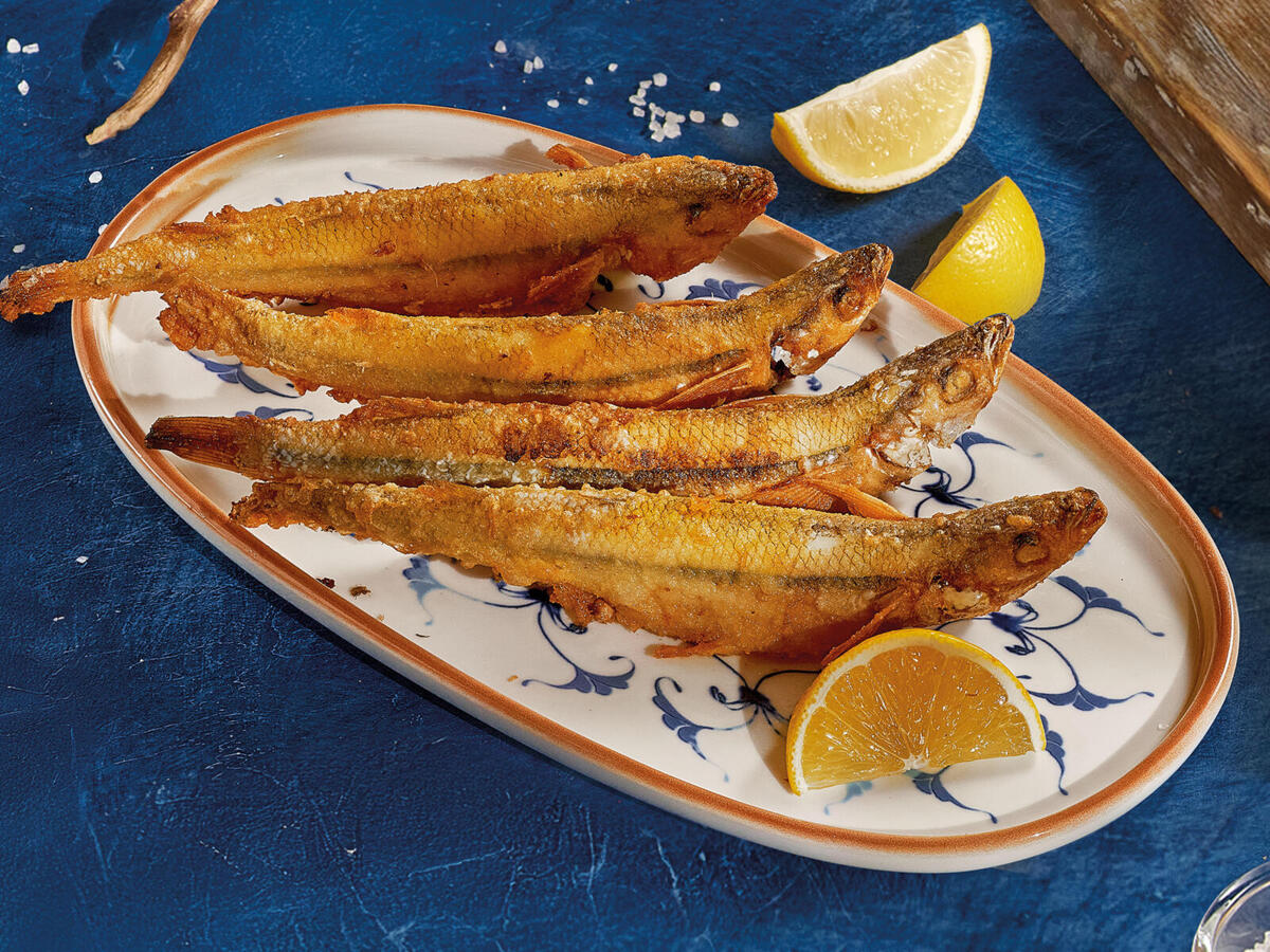 Свежая корюшка в кляре с азиатскими нотками получается хрустящей снаружи и сочной внутри.Подается с долькой лимона. Вес 320/30 г