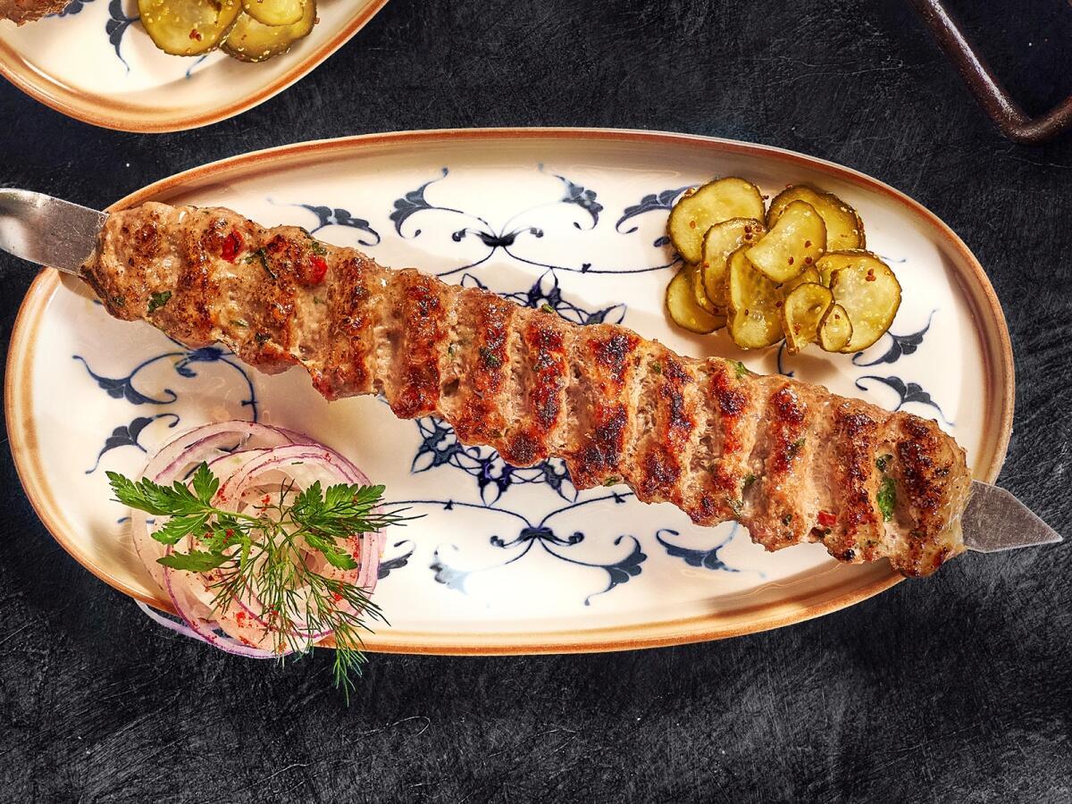 Шашлык из рубленой баранины с добавлением свежей зелени и острого перца. Подается с луком и острыми огурцами. Вес 150/20/30 г