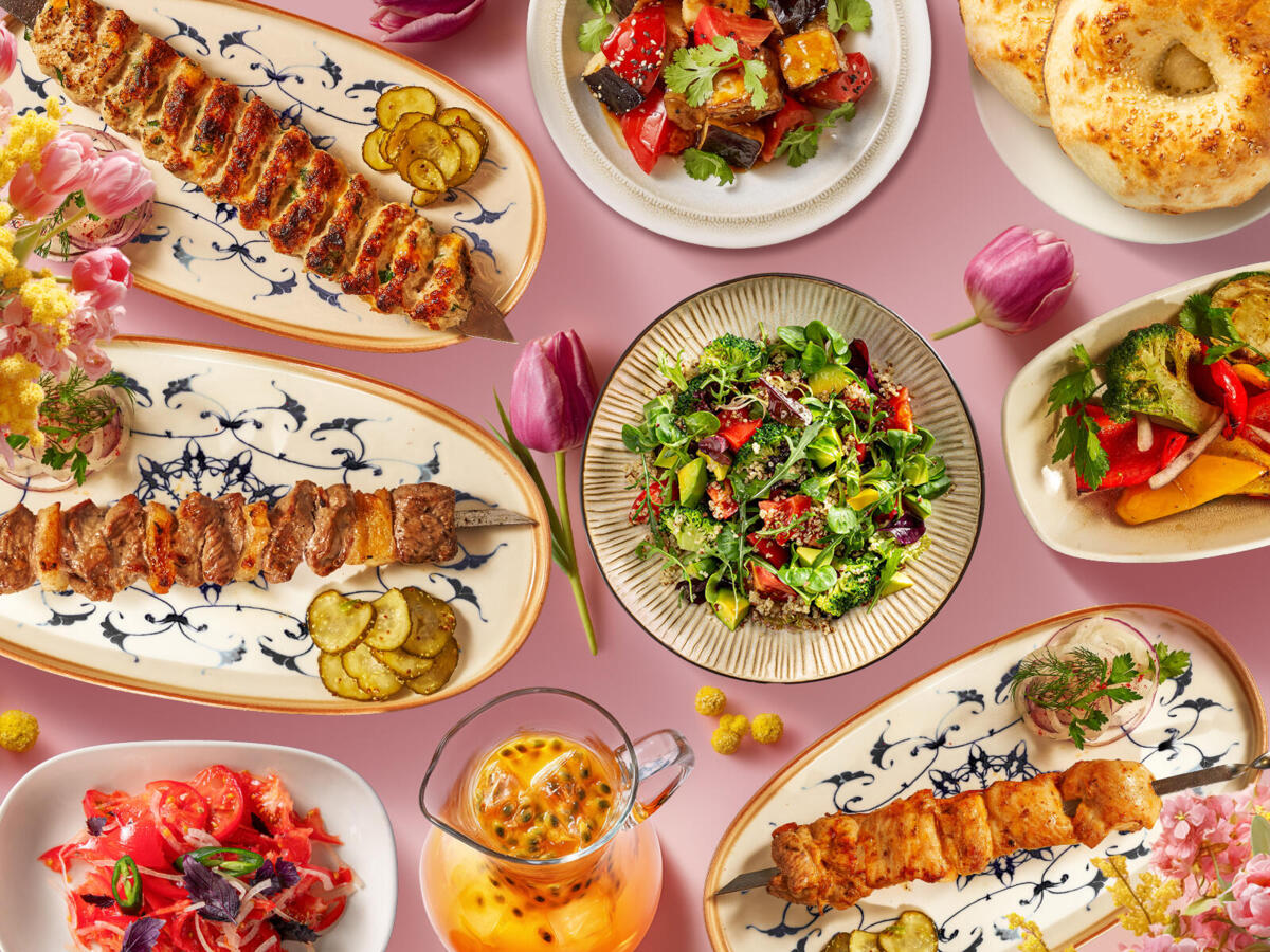 Ачик чучук салат, салат азиатский, микс салат с авокадо и киноа, шашлык из курицы, овощи на мангале, шашлык из баранины, кебаб из цыпленка с сыром, тандырная лепешка - 2 шт,, лимонад манго-маракуя 1л.