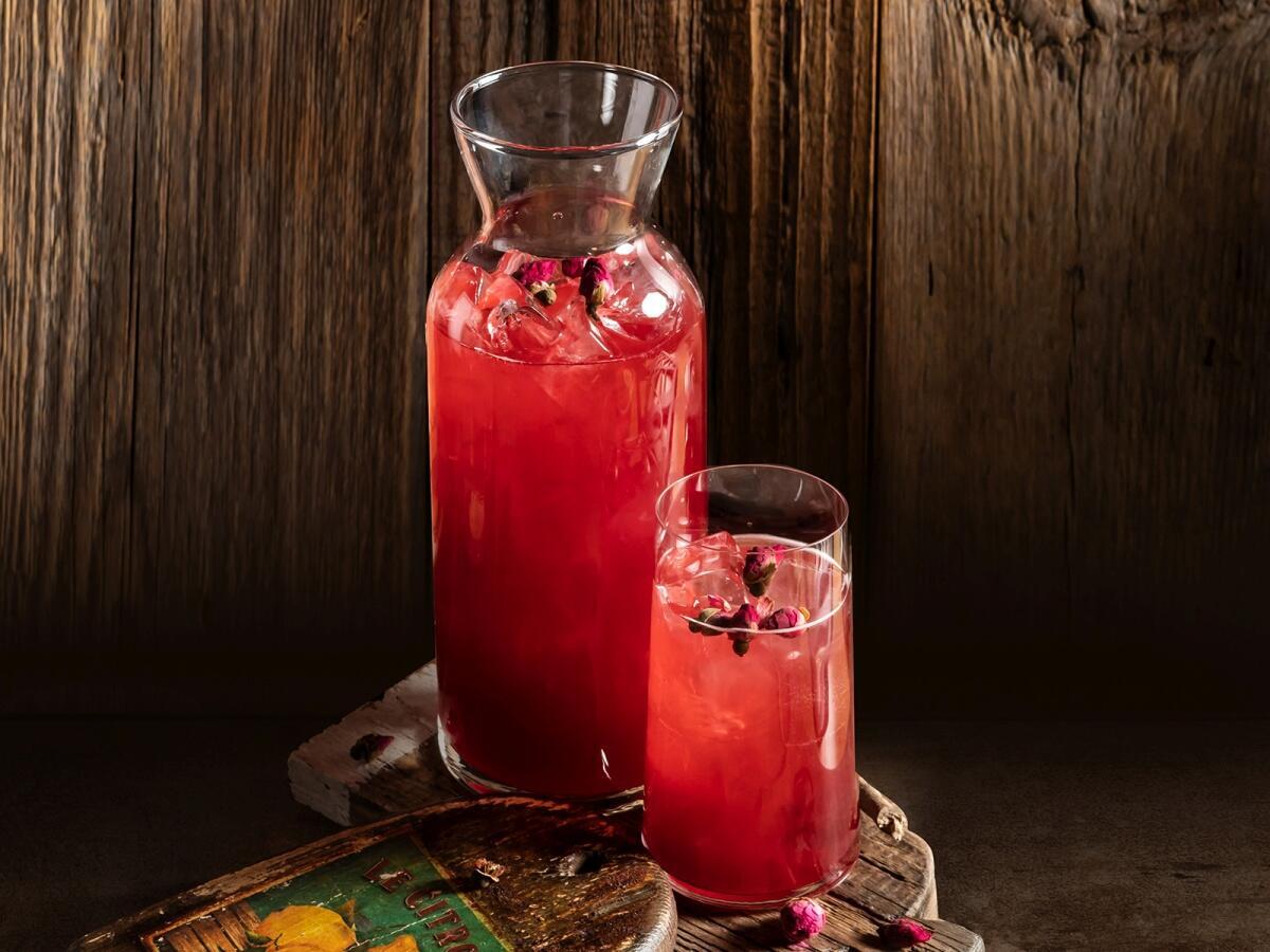 Каркаде сухой, сироп малина, пюре малина, вода питьевая газированная, роза бутон