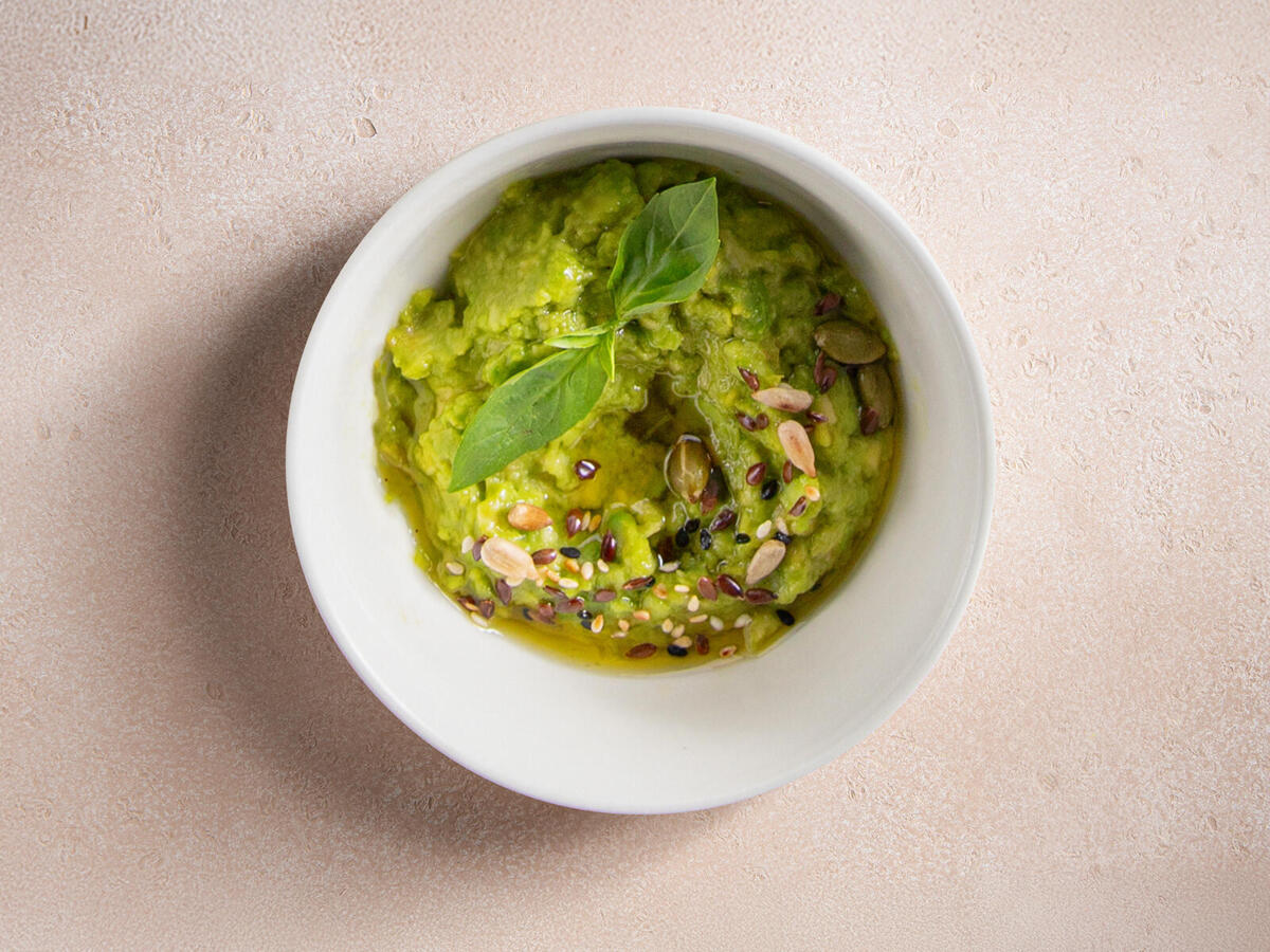 Нежный мусс из авокадо с лимонным фрешем и оливковым маслом. Подаём с миксом из семечек и веточкой базилика.