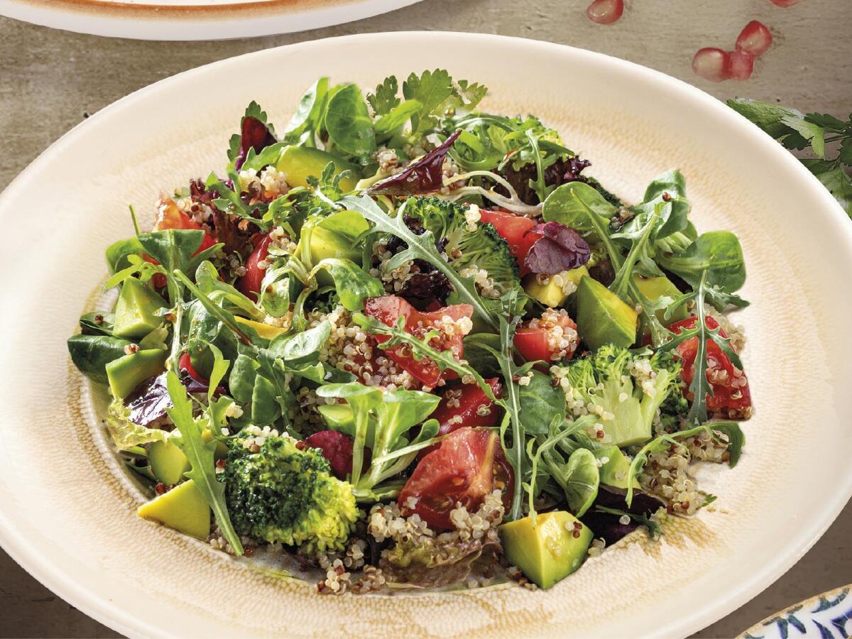 Микс из свежих салатных листьев, бланшированной брокколи, сладких томатов с авокадо и киноа. Подается под кунжутным соусом в азиатском стиле