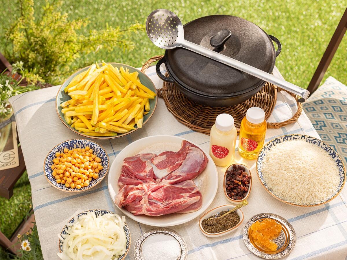 Полный набор для для самостоятельного приготовления в казане, праздничного плова по аутентичному рецепту. С виноградным сахаром, хлопковым маслом, курдюком, желтой узбекской морковью, горохом нут, изюмом, специальным рисом Лазер, нежной говядиной и ароматными специями. Вес 4100 г