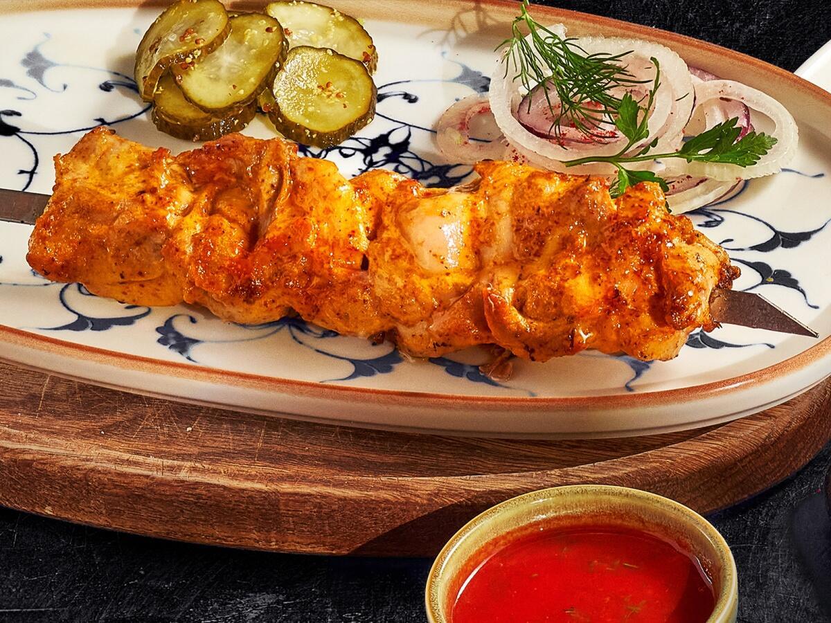 Сочный шашлык из филе куриного бедра. Подается с острыми огурцами, маринованным луком и зеленью. Вес 110/20/30 г