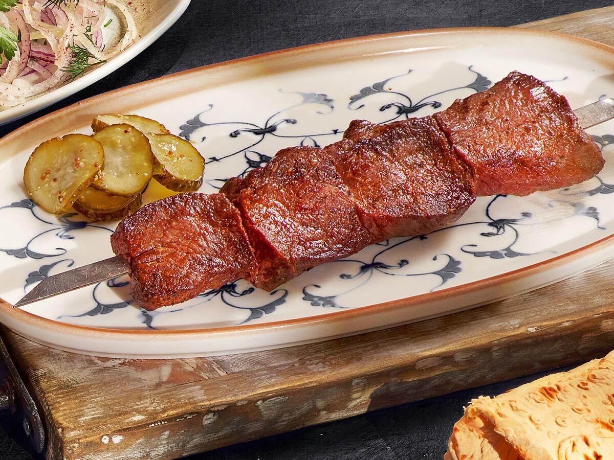 Сочный шашлык из говядины,маринованный по-кавказски 1/2 порции. Подается с острыми огурцами, маринованным луком и зеленью. Вес 70/20/30/30 г