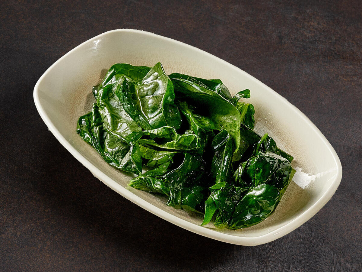 Свежий шпинат, нежно бланшированный с цитрусовым соусом. Подается с тархуном.