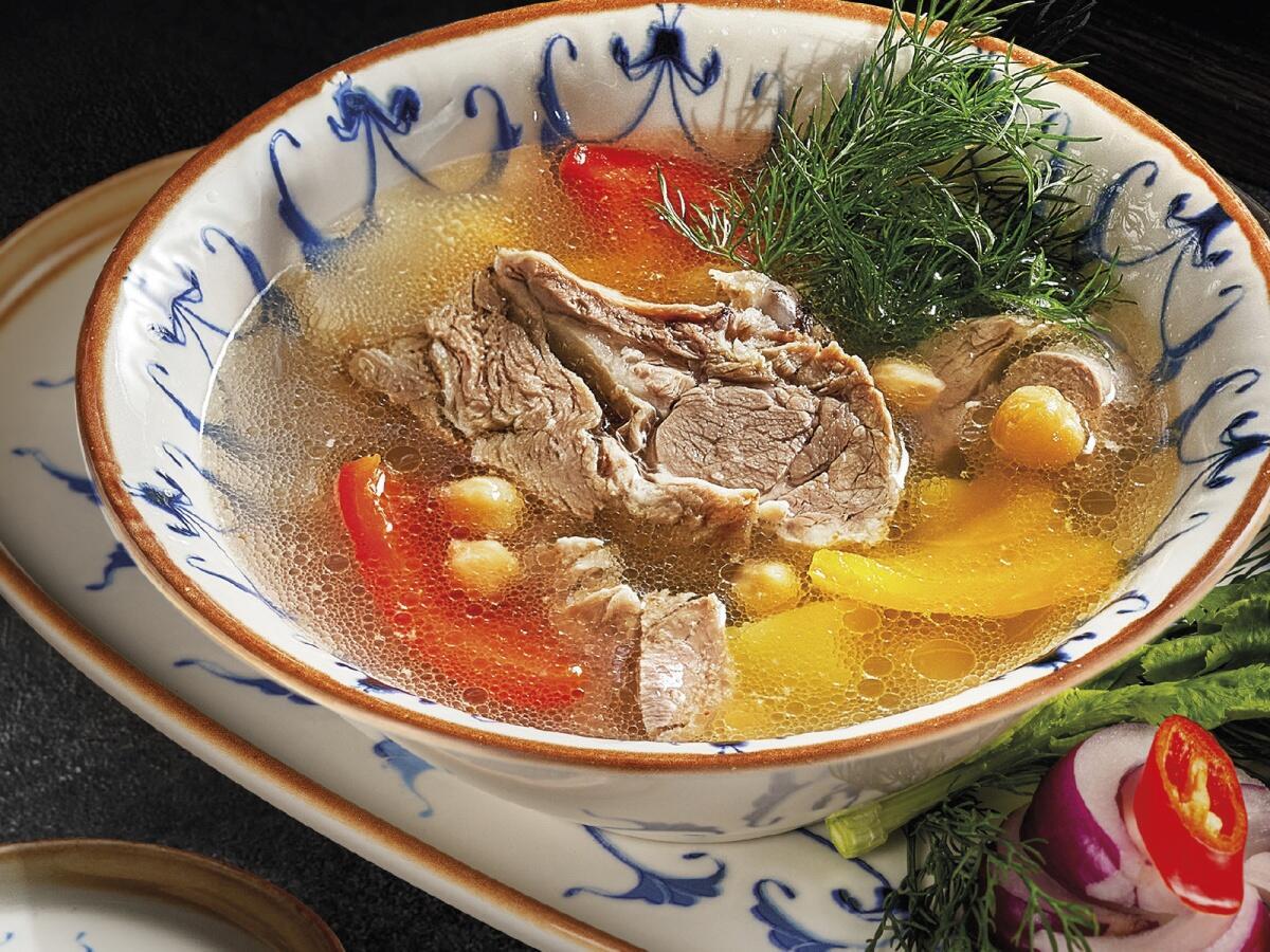 Ароматный прозрачный бульон с мясом ягненка, овощами и горохом нут. Вес 410/90 г