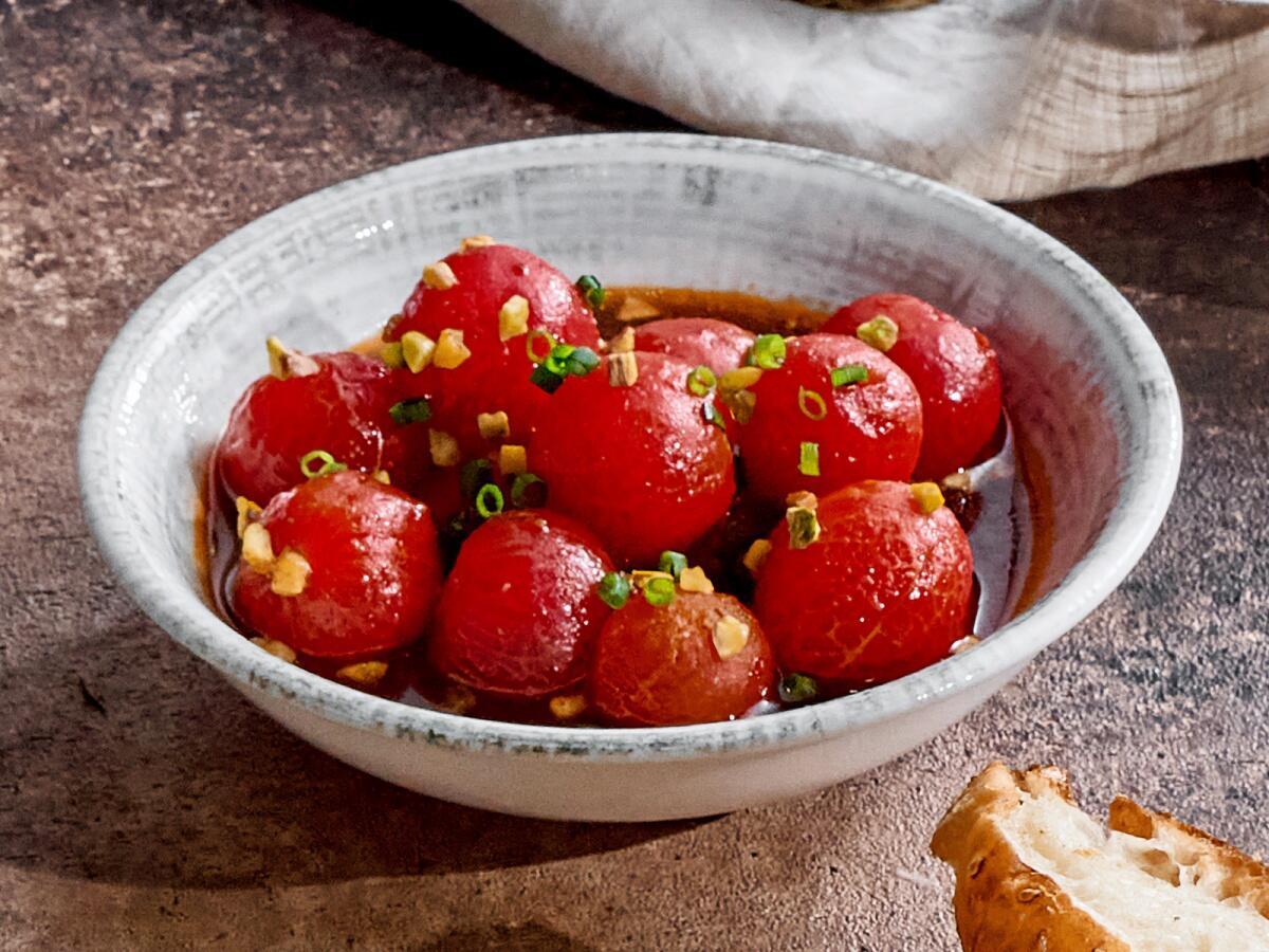 Помидоры черри,маринованные в соусе кимчи. Острая и сочная закуска. Вес 150/50 г