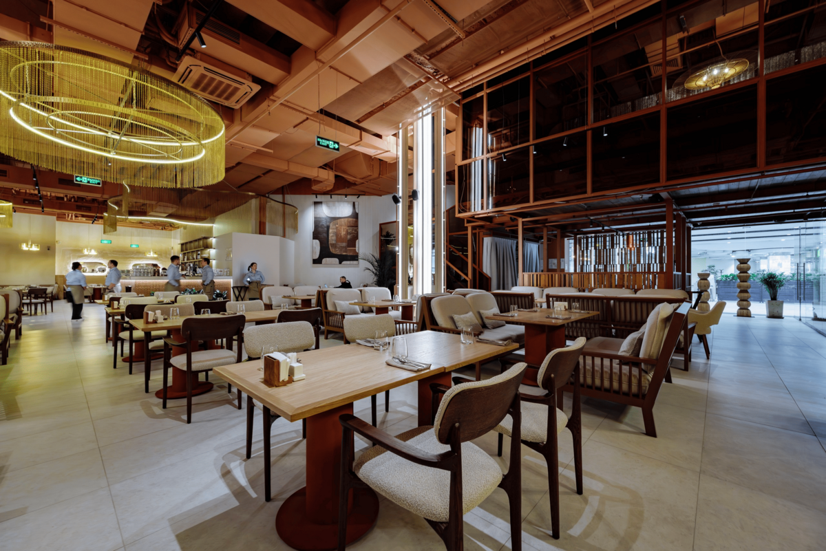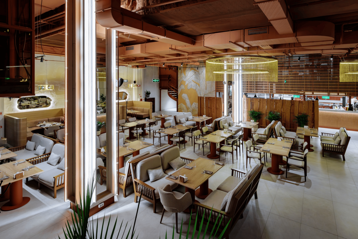 Интерьер ресторана сочетает уют и элегантность — тёплые оттенки, мягкий свет и детали, навеянные восточной эстетикой, создают идеальное пространство для встреч, отдыха и праздников.