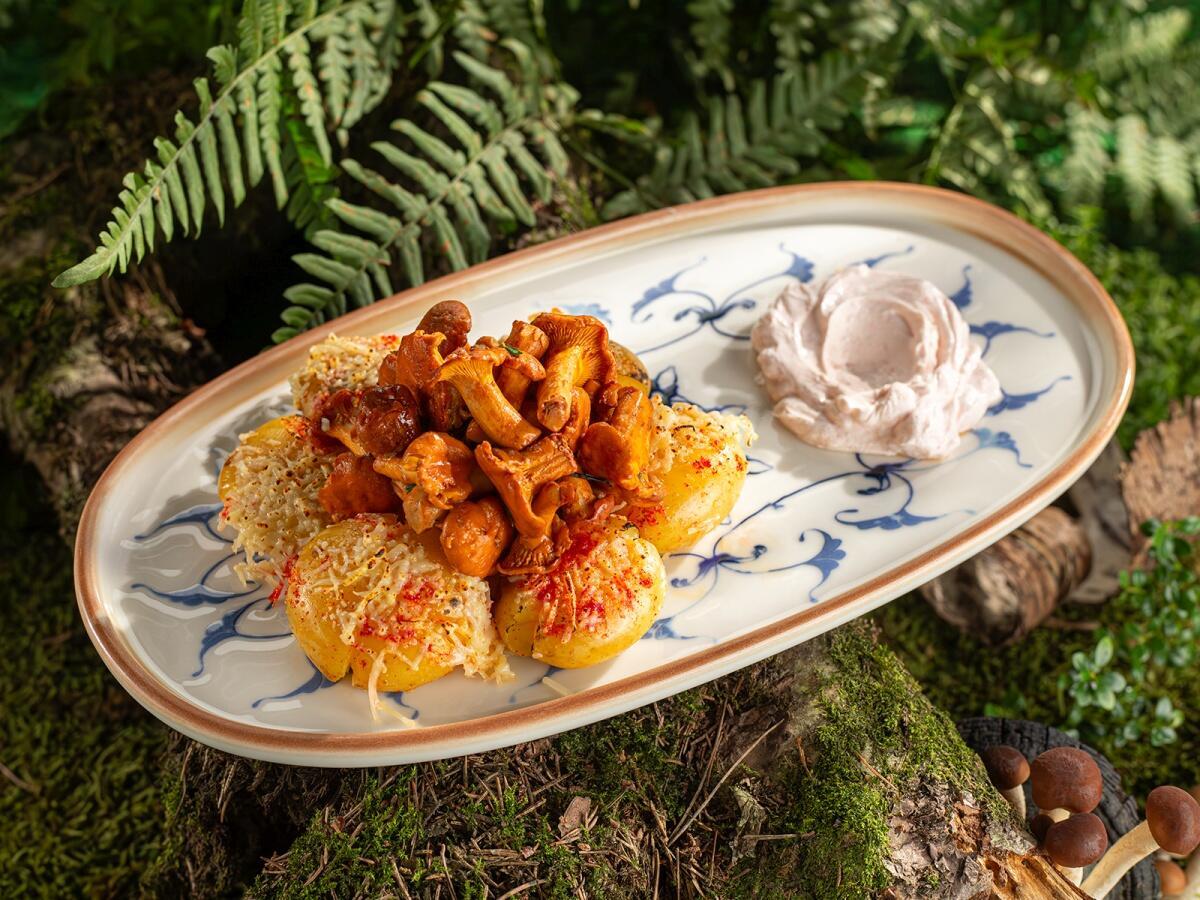 Ароматный картофель, запечённый с чесночным маслом и Пармезаном. Подаётся с обжаренными лисичками и авторским сметанным соусом. Украшается каплями копчёного масла, рубленным тархуном и копчёной паприкой.