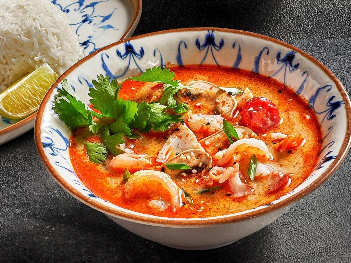 Знаменитый тайский суп с морепродуктами и грибами, приготовленный на оригинальном бульоне с добавлением кокосового молока и азиатских специй. Подается с паровым рисом и лаймом.